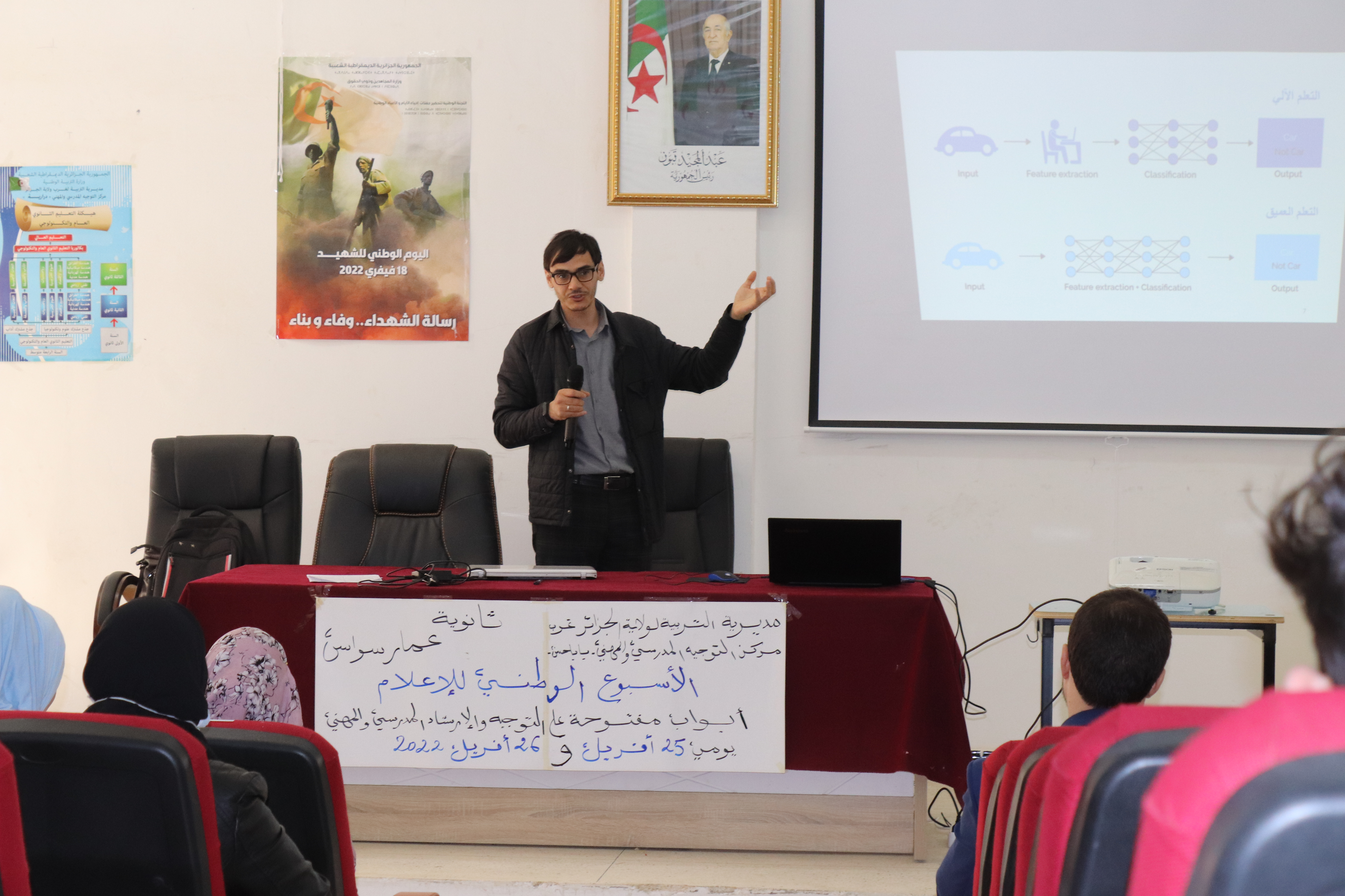 Le premier jour, le 25 avril, De riches présentations ont été animées au  Lycée Ammar Souas – Baba Hassan – par des spécialistes du développement humain et des chercheurs dans divers domaines technologiques, parmi les participants, le jeune checheur du CDTA, M. TAHIR ZEMMOURI a animé  une présentation sur l’Intelligence Artificielle et ses Applications.